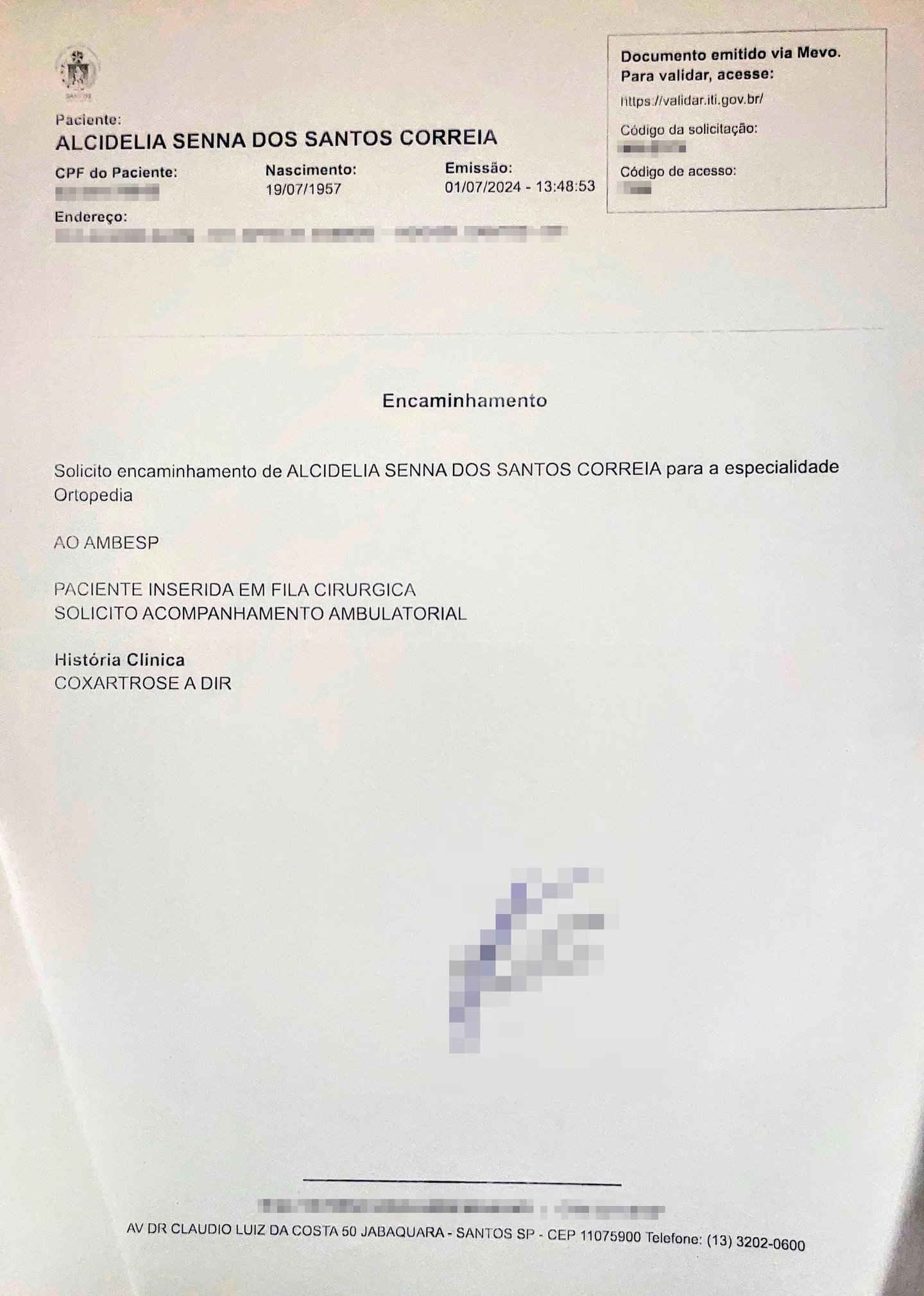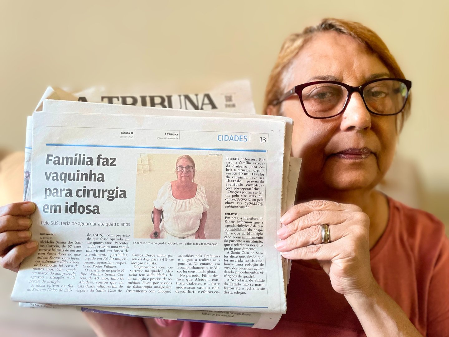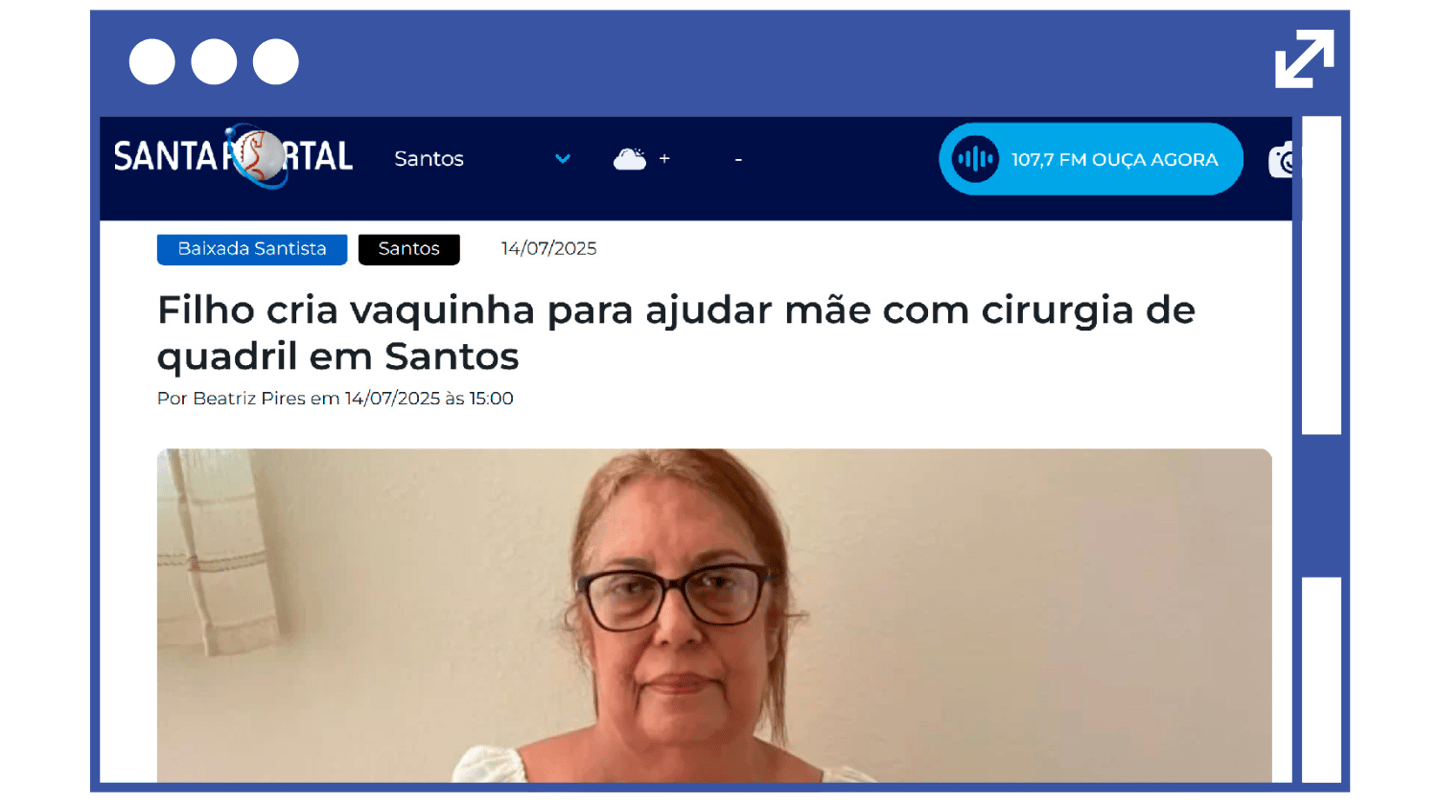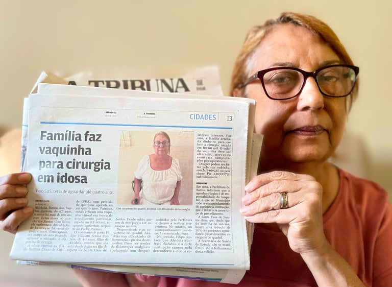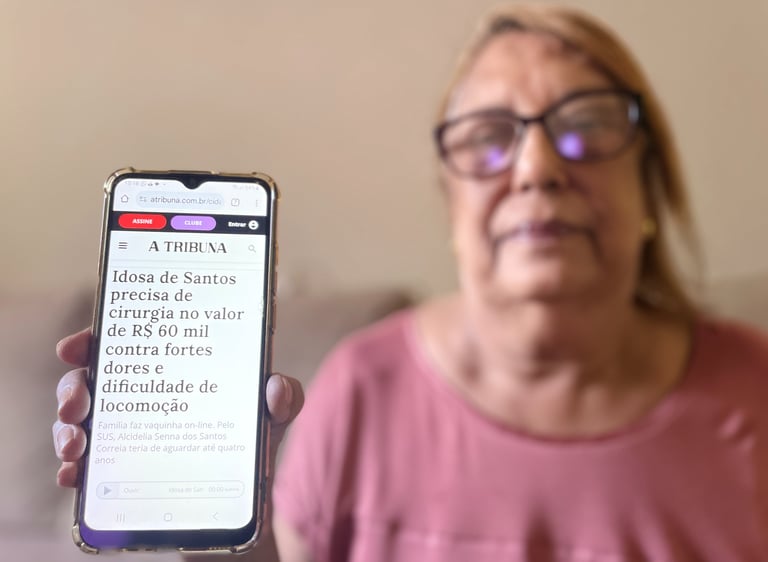 Aos 68 anos, Alcidelia Correia, santista e divorciada, divide a vida com seu filho único e muitas fortes dores diariamente. Há quatro anos, a coxartrose avançou no quadril esquerdo roubando sua liberdade e alegria de viver. A cirurgia é pra AGORA, mas o SUS impõe uma espera de 4 anos, andando apenas 20% da fila em 1 ANO – um tempo que o Lúpus e a Fibromialgia dela não permitem. Com fé inabalável, ela pede por sua ajuda na VAKINHA para, enfim, recuperar a dignidade de voltar a viver.